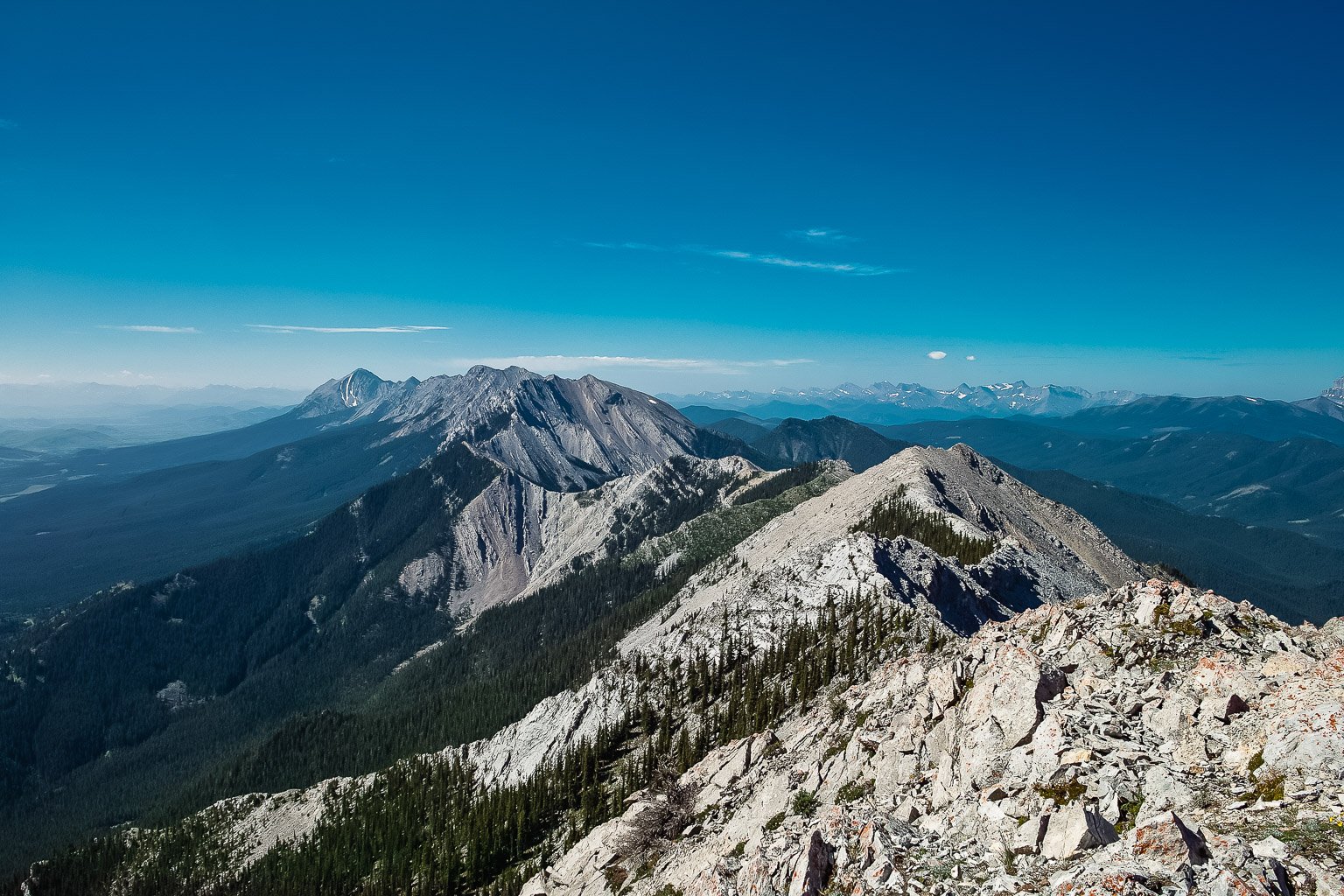From here to the summit there are multiple lines and many cairns to follow. I would rate some of the terrain as moderate but mostly it can be avoided. This was a terrific scramble on fairly decent rock with great views. The wind was actually much stronger on the ridge than closer to the summit which was a rare gift in the Crowsnest area!