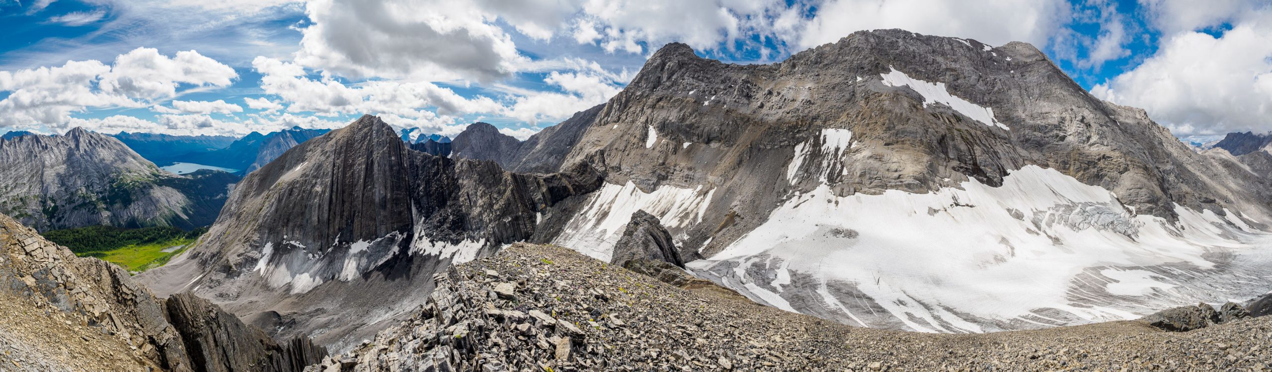Don’t get me wrong! I was having a lot of fun so far today. Views were stupendous towards Mount Sir Douglas and the Haig Icefield and I was enjoying the complexities of the route despite the rough terrain. As I continued working my way up the face I understood why it’s so hard to put a rating on it. Firstly, there’s no clear path up but rather dozens of small variations, each one presenting a different set of difficulties. Secondly, how do you put an alpine rating on terrain that is simply loose, steep and manky A.F.? How do you rate steep, hardpack dirt?