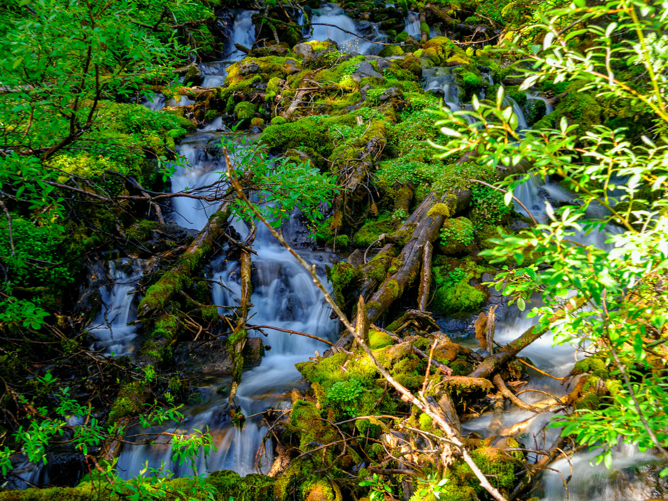 I left the Interlakes parking lot at 08:00 on my bike, knowing that despite today’s goals it wasn’t going to be drastically long either. Most of my approach and egress would be on established trails and the weather forecast was improving throughout the day so no need to get up at 03:30 for once. The first 4km were their usual bumpy and somewhat grumpy selves. I always forget how rough this first section is on the bike – especially when it crosses rubble slopes south of Mount Indefatigable. After locking the bike to a nearby tree I continued up the excellent trail towards Forks Campground. Birds were chirping and I was happy as I tramped through the forest for an hour towards the camp.
