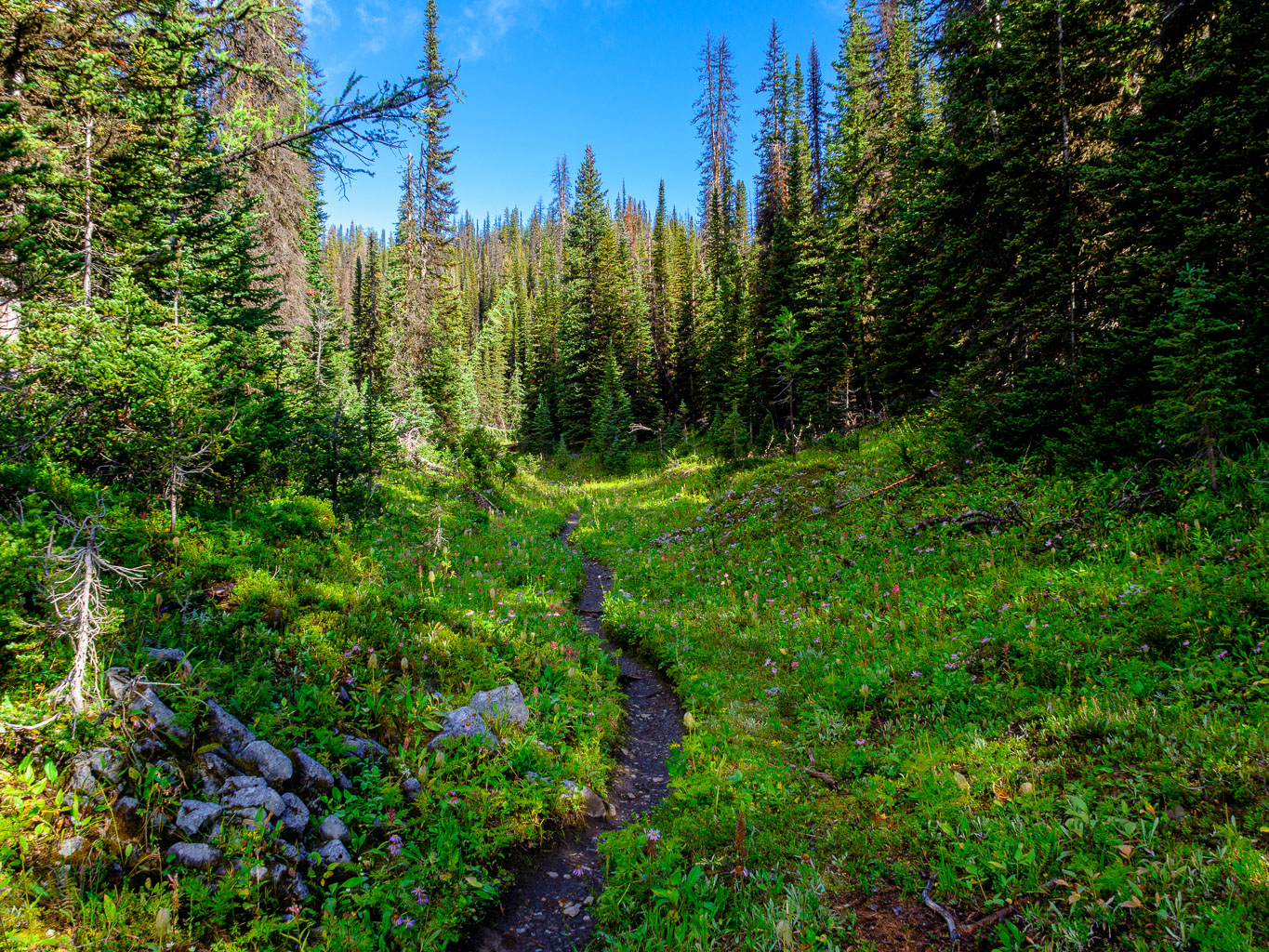 As I turned off the main track, heading north up the Maude-Lawson Trail, I was following a large group of 8 backpackers presumably just starting out from Forks. There seems to be a lot of grizzlies out this year so I didn’t mind all the human activity on the trail today. I’d met two young gentlemen earlier who’d warned me of a grizzly encounter coming down from Three Isle Lake, so I was aware of at least one bruin in the vicinity.